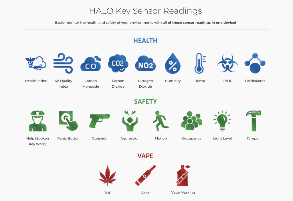 Halo is an all-in-one advanced AI smart sensor technology that can monitor your environment for smoking, vaping, and cannabis usage in real-time. Halo measures indoor air quality and can detect issues which can cause harm to employees, staff, teachers, students, or visitors. Halo alerts management to harmful air quality levels, and if set up with Avigilon video surveillance systems can record and identify people not following the smoking policy.